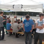 Das Hoffest des G6 – Haus für Jugend, Bildung und Kultur stand diesmal ganz im Zeichen der Einweihung des zweiten Bauabschnitts. Dieser konnte von den zahlreichen Besuchern beischtigt werden und auch sonst war wieder jede Menge geboten: die verschiedenen Gruppen die mit dem G6 zusammenarbeiten luden an zahlreichen Ständen zum Mitmachen ein oder traten auf der Freiluftbühne auf. Auch der Schachklub war wieder mit von der Partie: wir hatten zahlreiche Bretter zum Spielen dabei und auch das Gartenschach lockte etliche Kiebitze an. Zudem hatten wir uns eine Aktion ausgedacht, bei der Körper und Geist gefordert waren: zunächst musste man zum nahegelegenen Basketballfeld laufen und dort einen Korb erzielen, ehe man ein Mattaufgabe zu lösen hatte.