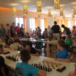 Danach ging es in die Mensa der Schule wo die Bretter aufgebaut waren. Die Gruppenleiter Sabine Goehrke und André Schilay (SK Neumarkt) gaben die Paarungen der ersten Runde bekannt und kurz nach 13h war der Raum vom Klacken der Uhren erfüllt. Die Eltern staunten nicht schlecht wie zielstrebig die ersten Figuren geschlagen und Jagd auf den gegnerischen Monarchen gemacht wurde. Einige bewiesen hier bereits sehr großes Geschick und so wurde bald an der ersten Brettern stolz „Schachmatt!“ verkündet. In manchen Partien beratschlagten die Spieler ob in der entstandenen Stellung überhaupt noch ein Matt möglich wäre und einigten sich friedlich auf ein Unentschieden. Oft nutzten die Spieler auch die komplette Bedenkzeit aus, so dass letztlich die Zeit den Ausgang der Partie entschied.