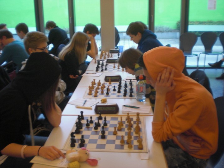 Das Spitzenduell Zweiter gegen Dritter begann denkbar schlecht für uns. Simon Drechsel hatte in der Eröffnung einen Bauern geopfert, übersah dann aber dass der geplante Rückgewinn einen Figurenverlust zur Folge hatte. Lorenz Schilay geriet im Mittelspiel in die Defensive und musste einen Doppelbauer-Isolani in Kauf nehmen. Doch dank der Kontrolle der einzig offenen Linie war auch für seinen Gegenüber nichts mehr drin und man remisierte. Maximilian Lutter verpasste es den forschen Angriff seiner Gegnerin mit in der Mitte verbliebenem König zu wiederlegen. Als dieser dann auf die andere Seite rochiert hatte, wollte Maximilian am Damenflügel angreifen, doch sein König geriet zuerst entscheidend unter Beschuss. Kevin Beesk übersah einen starken Zug mit dem er deutlich in Vorteil hätte kommen können. Mit wenig Zeit auf der Uhr verlor er zwei Figuren für einen Turm und musste nach der Zeitkontrolle aufgeben.