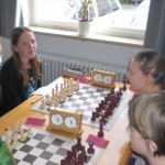 Eva fand sich am letzten Brett gegen Juliane Kißler (SC Noris Tarrasch Nürnberg) wieder. Nach zähem Beginn schuf Eva ihrer Gegnerin zunächst einen Doppelbauern und kam mit einem Abzugsangriff zu einem Quali-Gewinn. Danach folgte noch eine Figur und ein schnelles Ende auf der Grundreihe. Am Nachmittag kreuze Eva mit der nächsten Tarrascherin in Person von Claudia Laura Homfeldt die Klingen und überraschte dabei ihren Trainer mit einem „interessanten“ dritten Zug. Dadurch bekam Claudia das bequemere Spiel und Eva hatte viel Dusel als beide einen möglichen Figurenverlust von Eva übersahen. Danach bekam Eva die b-Linie und das aktivere Figurenspiel, wonach Claudia die Dame für Turm und Figur geben musste was sich Eva nicht mehr nehmen ließ.