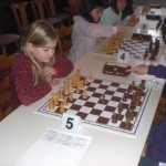 Acht Teilnehmerinnen waren in der U14 am Start, so dass auch hier ein Rundenturnier ausgetragen werden konnte. Fabienne startete mit 3/4 gut ins Turnier und musste sich dabei nur der U12-Meisterin des Vorjahres Alexandra Gerber (SW Nürnberg Süd) geschlagen geben. In Runde fünf stand das Duell mit der verlustpunktfreien Setzlistenersten Stefanie Walter (SV Lauf) an. Stefanie opferte eine Figur für zwei Bauern und Angriffschancen auf den unrochierten König. Aber Fabienne verteidigte sich umsichtig und kam materiell weiter in Vorteil ehe sie auf Zeit gewann. Damit übernahm sie dank der besseren SoBe die Führung und verteidigte diese mit einem weitreren Erfolg in der nächsten Runde. Nun stand nur noch Miriam Strobel (SC Erlangen 48/88) zwischn Fabienne und ihrem ersten Meistertitel. Und es lief zunächst sehr gut: Fabienne konnte Dame für Turm und Figur erobern und hatte obendrein einen guten Angriff auf die Rochadestellung. Doch dann ging ein Läufer verloren und Miriam gelang es ihren König auf den Damenflügel zu evakuieren. Später musste Fabienne noch eine Qualität geben und sah schon wie die sichere Verliererin aus, aber Miriam gestatte eine Zugwiederholung. Mit sehr guten 5,5 Punkten belegte Fabienne Rang zwei und qualifizierte sich damit zum vierten Mal für die Bayerische.