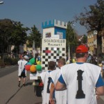 Es ist wieder Volksfest-Zeit in Neumarkt und am ersten Sonntag stand der traditionelle Festumzug auf dem Programm. 100 Gruppen scheuten die tropischen Temperaturen nicht und präsentierten den Zuschauern (ob der großen Hitze waren es diesmal weniger – aber wer mag es ihnen verdenken) viele gelungene Beiträge. Wir hatten wieder unseren 2,5m hohen Turm zusammengebastelt und warfen uns die Schach-Ponchos über (wobei bis auf eine Ausnahme die weißen Umhänge den Schwarzen vorgezogen wurden…), was auch bei der Festzug-Jury gut ankam.