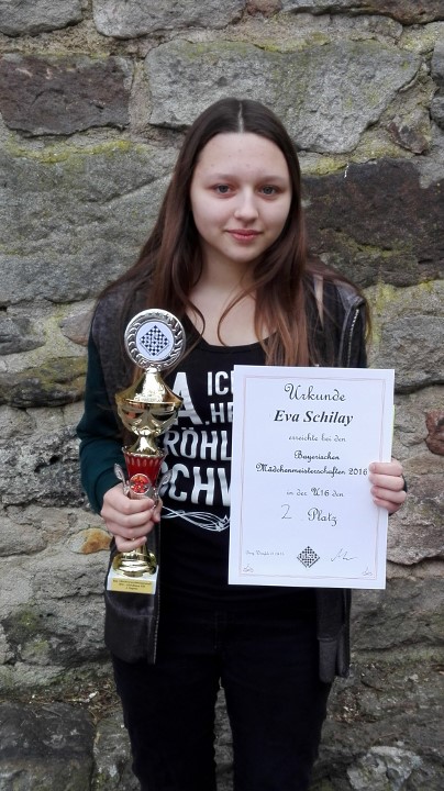 UPDATE: Eva Schilay ist Bayerische Vize-Meisterin in der U16w! Nach einer ruhigen ersten Turnierhälfte mit vier Remis, legte sie einen fulminanten Schlussspurt mit drei Siegen am Stück hin, schlug in Runde sechs die mittlerweile dreifache Bayerische Meisterin Sindy Kail und rang zum Abschluss in einer starken Angriffspartie mit Marie Oberhofer eine weitere Titelträgerin (2014) nieder. Damit sicherte sie sich Rang zwei und qualifizierte sich nach Lorenz (2012) und Maria (2013) als drittes Mitglied des SKN für die Deutschen Meisterschaften.
