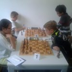 Nach der Mittagspause ging es gegen den klaren Favoriten Erlangen. Josef kam schon schlecht aus der Eröffnung und ließ dann noch eine Figur stehen. Denis hatte ebenfalls schon eine weniger und verschmähte obendrein den Rückgewinn. Später bekam er aber noch eine Qualität und auf einmal war die Stellung gar nicht mehr so klar. Als er aber seinerseits eine Qualität abgeben musste war gegen den gegnerischen Freibauern kein Kraut mehr gewachsen. Maria kam ausgezeichnet aus der Eröffnung und sammelte zwei Bauern ein. Sogar ein Dritter hätte hinzukommen können, aber sie traute dem Braten nicht und tauschte lieber die Damen. Nach zwei weiteren Ungenauigkeiten verflachte ihr Vorteil und sie konnte ihren Doppelbauer-Isolani nicht halten, wonach man sich auf Remis einigte. Daniel stand im Mittelspiel nach einem Bauernverlust schon schlechter, kam dann aber zu einem gefährlichen Angriff auf den langrochierten gegnerischen König. In sehr aussichtsreicher Stellung nahm er ein Remisgebot zum 1:3 Endstand an.