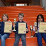 Starke Mädchen gab es auch in der U12, führten doch Olha Ratushna (SW Nürnnerg Süd) und Smirithi Suryaprakash (SF München) die Setzliste an. Und Smirithi startete auch mit 4/4 perfekt ins Turnier, Olha dagegen teilte in den Runden drei und vier den Punkt gegen Sarah Gubler (TSV Kareth-Lappersdorf) und Nithya Ramayanam (SC Erlangen 48/88). Das direkte Duell jedoch entschied Olha in Runde fünf für sich und sie bezwang danach auch Johannes Dombert (SK Kelheim). Smirithi hielt mit einem Erfolg über Maximilian Warziwoda (SC Windischeschenbach) Schritt und somit gingen beide punktgleich in die letzte Runde. Dort gewann Smirithi auch gegen Rasul Ismailov (SC Bechhofen), während sich Olha im Vereinsduell Alex Averin geschlagen geben musste. Somit holte Smirithi mit 6 Punkten den Titel vor Alex (5,5) und Olha (5). Punktgleich dahinter klassierten sich Maximilian Müller (SC Noris-Tarrasch Nürnberg), Sarah und Johannes. Dominik Erhard von der Schulschachgruppe des Willibald-Gluck-Gymnasiums nahm den Kampf mit den Vereinsspielern auf und belegte mit 3 Zählern Platz 20.