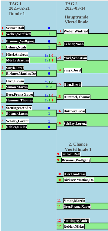 Bei der Bayerischen U25 Meisterschaft gab es erstmals eine Live-Übertragung der ersten vier Bretter und auch der Modus mit 15 Minuten + 5 Sekunden war eine Premiere. Die Setzliste führte Viktor Ratushnyi (SW Nürnberg Süd) vor Philipp Mark (SC Windischeschenbach) und dem Titelträger von 2023 Lorenz Gauchel (FC Bayern München) an. Doch nach einer erfolgreichen Auftaktrunde, mussten alle Drei schon in der zweiten Partie Federn lassen. Lorenz spielte gegen Arthur Ratushnyi (SW Nürnberg Süd) remis, während Viktor gegen Johannes Denz (SC Windischeschenbach) und Philipp gegen Lokalmatador Andres Hierl eine Niederlage quittieren mussten. Johannes bezwang danach auch die Vorjahresdritte Verena Gauchel (FC Bayern München) und übernahm die alleinige Führung, da Andreas gegen Arthur remisierte. In der vierten Rudne erwischte es dann auch Johannes, der gegen Lorenz den Kürzeren zog. Letzterer lag nun an der Spitze, wohingegen Andreas gegen Felix Partsch (SK Schweinfurt 2000) verlor. Felix hatte aufgrund einer ungeplangten Verzögerung bei der Anreise die erste Runde verpasst, war aber nach drei Siegen nun mittendrin im Titelkampf. Dies unterstrich er mit einem Remis gegen Lorenz, wodurch Johannes mit einem Erfolg über Andreas mit Spitzenreiter Lorenz nach Punkten gleichzog. Viktor gewann gegen Verena und lag einen halben Zähler zurück. In der sechsten Runde trennten sich Lorenz und Viktor unentschieden, so dass Johannes mit einem Sieg über Igor Malakov (SK Neumarkt) das Feld mit einem halben Punkt Vorsprung anführte. Die letzte Runde sah einen Sieg von Felix gegen Johannes und auch Lorenz gewann seine Partie gegen Noa Chanishvili (SC Noris Tarrasch Nürnberg), der auch in der U10 hätte spielen können. Damit gelang Felix das Kunststück sich den Titel trotz des verspäteten Einstiegs zur zweiten Runde mit 5,5 Punkten dank der besseren Buchholz vor Lorenz zu sichern. Rang drei belegte Johannes mit 5 Zählern vor Viktor (5) und Andreas (4,5). Letzterer behielt zum Abschluss im Vereinsduell gegen Igor die Oberhand, der mit 3,5 Punkten Neunter wurde.