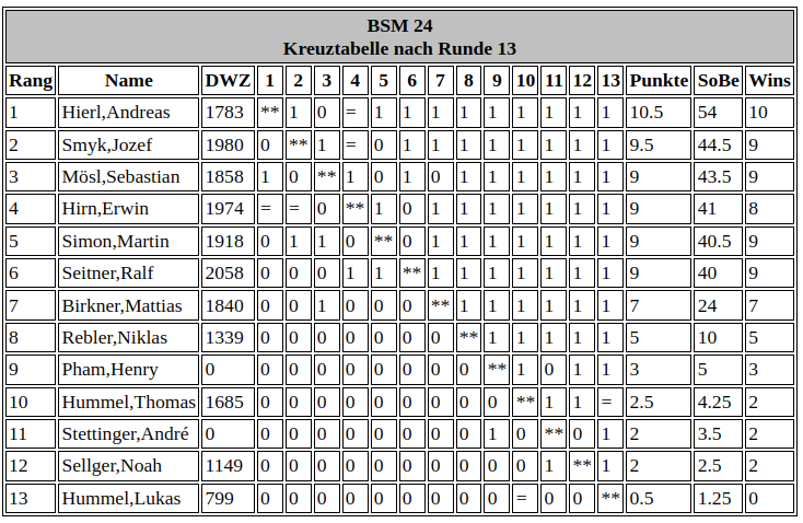 13 Teilnehmer fanden sich gestern Abend im Gesindehaus aus, um den Blitz-Stadtmeister 2024 und damit den Nachfolger von Ralf Seitner auszuspielen. Am Start war wieder einmal die Creme de la creme der ersten Mannschaft: Ralf, Jozef, Erwin, Martin und natürlich auch der frischgebackene Stadtmeister im „Langschach“ Andi Hierl.