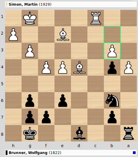 Nachdem in der letzten Runde bereits das Endspiel zwischen Wolfgang Brunner und Noah Lehner eine längere Diskussion wert war, kam es auch in dieser Runde wieder zu beachtenswerten Situationen gegen Ende des Spiels mit Martin Simon. Das Mittelspiel verlief nicht besonders erfolgreich für Wolfgang und nach Zug 28 fand er sich als Schwarzer in dieser Lage wieder: