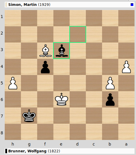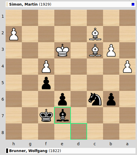Martin hat den h-Freibauern und will gerne auf der a-Linie auch einen. Sein Läuferpaar ist wahnsinnig stark und er darf sich natürlich nicht auf einen Tausch hin zu ungleichen Läufern einlassen. Außerdem beachte man die Farben der Umwandlungsfelder h8 und a8 wegen potentiell „falschen“ Läufern! Hier zog Martin den harmlos ausschauenden Zug 43.Ld3??, was den ganzen Vorteil vergibt, weil er dem König das wichtige Feld d3 nimmt. Was folgt, lässt sich leicht imaginieren. 43..Lc5+
