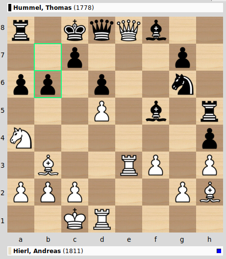 Fast ein jeder Schachspieler weiß selbst im hohen Alter noch, von wem er die ersten Züge gelernt hat. Andi Hierl ist nun zwar noch weit vom hohen Alter aber – wie er in der Partie-Nachbesprechung berichtete – weiß er heute noch, wem die Eröffnungszüge verdankte, mit denen er eben locker die Partie gegen Thomas Hummel gewann: unserem langjährigen Spitzenspieler und -trainer Kevin Beesk. Zwar habe er, Andi, die Nebenvariante erst vor einem halben Jahr wieder aufgefrischt,aber wenn es läuft, dann läuft es. Schauen wir selbst auf die Stellung nach dem 23. Zug von Thomas: