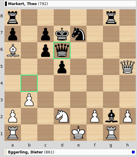 Wäre Passen im Schach eine Möglichkeit, müsste man annehmen, dass Thomas einige Züge ausgesetzt hat, so unterentwickelt und unkoordiniert sind seine Figuren. In dieser Stellung setzt es auch schon den Knock-out: 24.Sxb6+! cxb5 (erzwungen) 25.Dc6+ und es folgt auf jeden Fall Te3-e8 entweder mit Matt oder Damengewinn. Thomas gab auf.