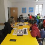 Nach zwei Stunden sah es dann schon nicht mehr so toll aus: Mattias optisch schöne Springer standen zwar noch, als wesentlich wirkmächtiger erwies sich aber der gegnerische, schwarzfeldrige Läufer, und Mattias war drauf und dran im Dickicht der Drohungen und Felderschwächen den Überblick zu verlieren. Thomas Läuferopfer hatte nicht die erwünschte Wucht entfaltet und er kämpfte inzwischen mit einem Turm gegen das Läuferpaar, währenddessen sah sich Timon einem erdrückenden Angriff ausgesetzt, der es ihm nicht erlaubte Turm und Springer ins Spiel zu bekommen. Bei Paul Spangler deutete sich allmählich an, das die Aktivität des verbliebenen gegnerischen Turms und Springers gegen Pauls zwei Türme die Qualität kompensierte und erstmal kein Weiterkommen in Sicht war. Kurze Aufregung an Christophs Brett als sich sein Gegner lautstark beschwerte über Christophs notorischen Zwang, wenn selbst am Zug, erstmal – völlig regelkonform – mit einem „J’adoube“ die eigenen Figuren zu zentrieren. Zum Glück konnte sich Christophs Empörung in dem bereits vorhergesehenen Matt in 6 entladen. Inzwischen war es auch Paul Neppert (Brett 6) gelungen, ein im Prinzip gewonnenes Endspiel mit Turm gegen Springer und sehr vielen Bauern zu erreichen, was die Sorge über die ersten Bretter etwas milderte.