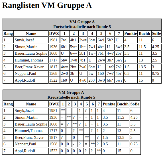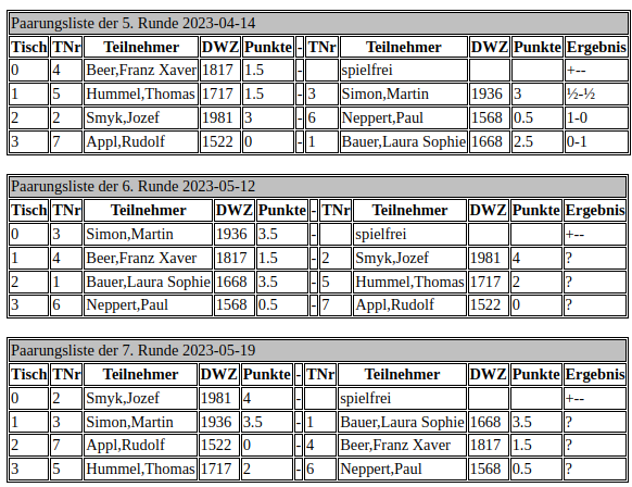 Wegen Terminschwierigkeiten (Qualifikation zur Deutschen Schulmeisterschaft) wird die 6. Runde teilweise bereits nächste Woche gespielt.