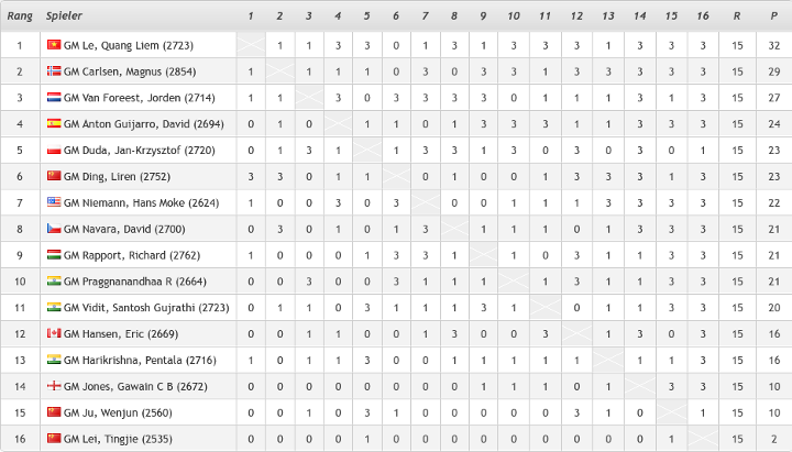 Einen ganz starken Auftritt legte Vincent Keymer am ersten Turniertag hin. Gegen die Nummern #3, #7, #9 und #13 der Weltrangliste erspielte er sich in jeder Partie Gewinnchancen. Zum Auftakt musste er sich Ding Liren am Ende noch geschlagen geben, doch danach bezwang er Weltcup-Gewinner Jan-Krzysztof Duda. Auch gegen Levon Aronian war der Gewinn greifbar, aber dieser entkam noch ins Remis. Anders Shakhriyar Mamedyarov, den Keymer trotz knapper Bedenkzeit sehenswert bezwang. Damit liegt Keymer mit 7 Punkten auf dem geteilten vierten Platz, Ding Liren führt mit 10 Zählern die Tabelle an. Erfreulicherweise ging wie gewünscht die Remisquote im Vergleich zum Vorjahr deutlich zurück: nur neun der 32 Partien endeten mit einer Punkteteilung und die sonst zahlreich gesehenen Zweiminuten-Unentschieden waren gar nicht dabei.