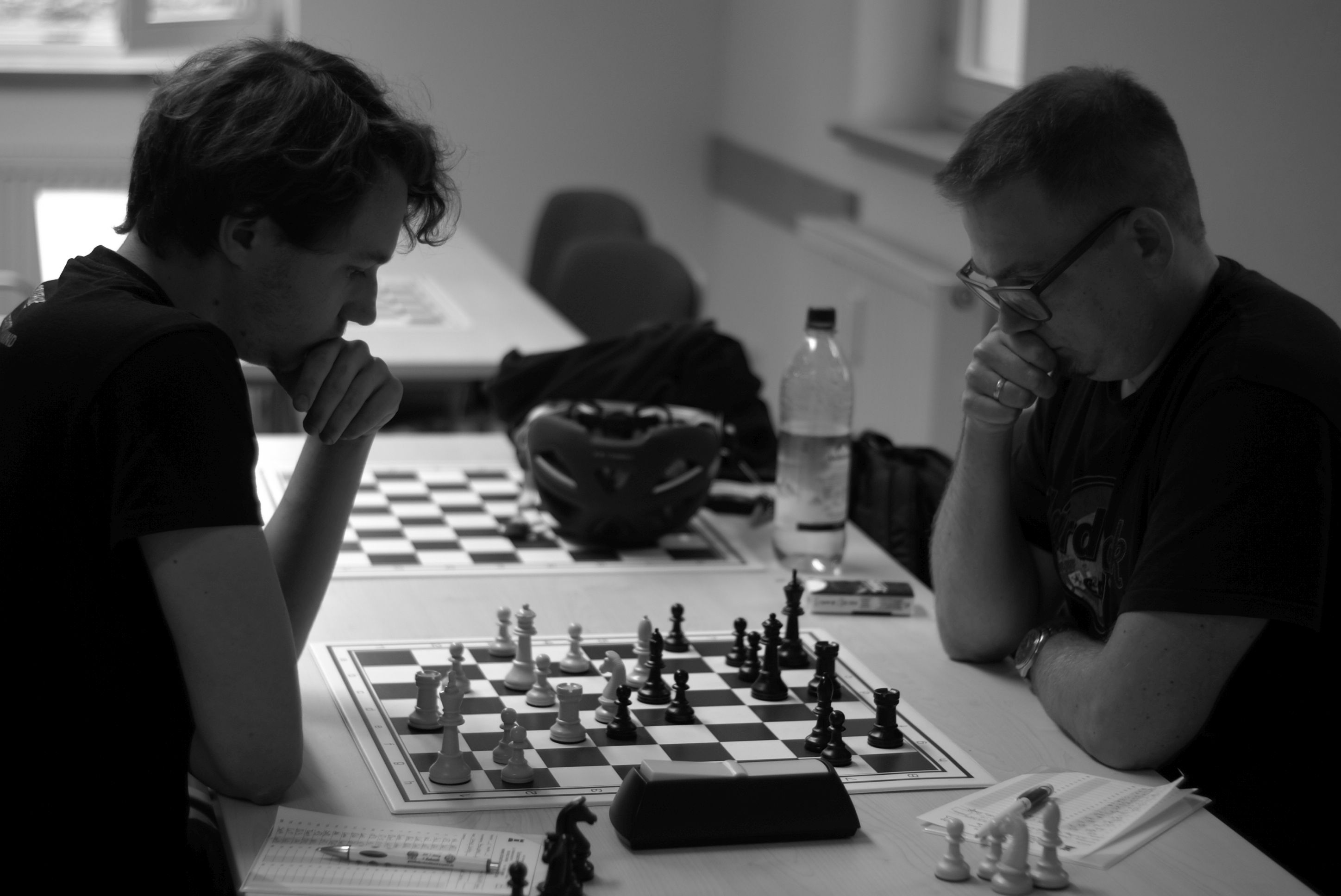 Nun musste also der Blitz-Tiebreak eine Entscheidung bringen. Ein Minimatch über 2 Blitzpartien (3 Minuten + 2 Sekunden Inkrement). Die erste Partie folgte dem Vorbild der heutigen klassischen Partie, Ralf konnte starken Druck auf der g-Linie gegen den weißen König entfalten. In höchster Zeitnot griff Lorenz fehl und erlaubte ein Damenopfer, das zum Matt führte. 1-0 für Ralf.
